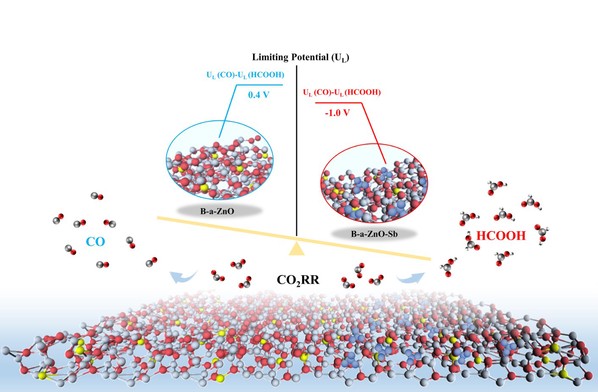 电催化转化二氧化碳在人工碳循环中发挥着重要作用。在工业生产中,CO和甲酸盐以其优异的生产经济性和工业价值性备受关注。过去几十年,大量研究致力于CO和甲酸盐生产,然而,催化剂高昂的成本、繁琐的合成和低产阻碍了扩大应用。同时,同步实现CO和甲酸盐高选择性生产的报道相对较少。鉴于此,团队开发了一种一步法合成无定型氧化锌的方法,告别了以往无定型氧化锌合成繁琐、耗时长的问题。通过引入杂原子,探究了其在电催化二氧化碳转化过程中间体的吸附对产物选择性的影响,实现了产物的选择性开关。进一步机理揭示了杂原子与氧化锌之间的电荷效应,削弱了CO和甲酸盐生产中间体的吸附,促进了产物选择性由CO到甲酸盐的转变。相关研究成果以题为“Selectivity switching between CO and formate for CO2 reduction on Sb modified amorphous ZnO by electronic effect”发表在Nano Research(2023,16,12144-12152,中科院一区TOP)。该论文第一作者为21级博士生陈红宇,通讯作者为王兆杰副教授和魏宝君教授。