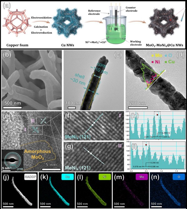 水分子吸附/解离和氢中间体吸附是碱性析氢反应的主要限制因素。钼镍合金被认为是工业应用中取代Pt基催化剂最可行的候选者之一。然而过强的氢中间体吸附限制了钼镍合金催化剂析氢活性的进一步提升,导致了更高的产氢能耗。受氢溢流现象促进吸附氢中间体转移的启发,团队将非晶三氧化钼掺入钼镍合金中,并负载于低功函数值的铜纳米线以应用于电催化析氢反应。机理研究表明,低功函数值铜载体作电子供体诱使钼镍合金d带中心上移,增强钼镍合金对水分子的吸附和解离;非晶三氧化钼掺杂引起的钼镍合金的独特几何构型加速氢中间体通过氢键和氢溢出转移,促进氢的生成,该电催化剂的析氢活性优于商用Pt/C催化剂,具有出色的长效稳定性。该研究为基于电子效应和几何效应的多步反应催化剂的设计提供了有价值的启示。相关研究成果以题为“Construction of pH-universal hydrogen evolution freeway in MoO3-MoNi4@Cu core–shell nanowires via synergetic electronic and geometric effect”发表在Nano Research(2023,16,12253,中科院一区TOP)。该论文第一作者为21级博士生陈晓东,通讯作者为王兆杰副教授、刘思远副教授和鲁效庆教授。