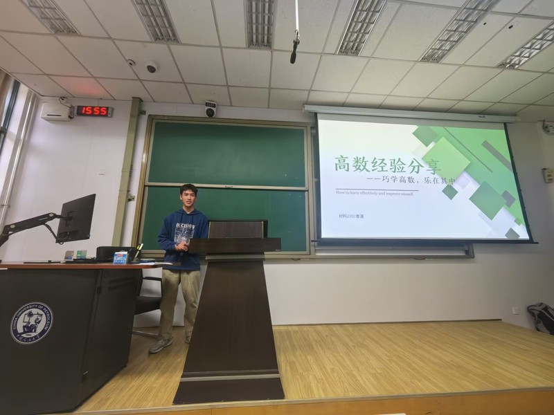 丛琬蕙为材料类2307-2308班的同学进行了分享,她认为,高数取得理想成绩的方法在于要对自己的学习能力充满信心,高数考察的重中之重在于书本内容,要抽出时间打牢基本功,脚踏实地学好每一个板块的内容。