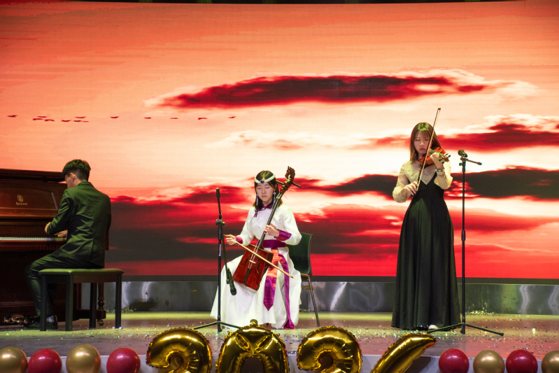 伴随着悠扬的钢琴,元旦晚会拉开帷幕。舞蹈《幻想童话》和啦啦操表演展现了青春活力;歌曲《失眠飞行》《光阴的故事》《千里之外》《乌兰巴托的夜》、舞蹈《Light it up》等则为全体同学呈现了一场精彩的视听盛宴;从古韵悠长的古筝到清新灵动的竹笛,从细腻的小提琴到动感的非洲鼓,从悠扬的马头琴到优雅的钢琴,器乐队的同学们带来的《青花瓷》《Golden hour》《安河桥》等节目为观众展现了和谐而丰富的“音乐画卷”,为晚会增添了独特的色彩和魅力;相声《一本正经的反诈手册》用幽默风趣的方式为观众宣传防范电信诈骗的相关知识2023级学生自编自导自演的影子剧《青春之影》与歌曲《让我留在你身边》,回顾了新生与石大相遇的三个月的难忘瞬间,表现了同学们对未来的憧憬和信心小品《真相只有一个》讲述了“抵制校园内偷外卖”的故事,既轻松幽默,又蕴含道理;朗诵节目《行经故梦,盛世华章》表演者用铿锵有力的声音达着家国情怀;最后,晚会在《相亲相爱》大合唱中圆满落幕。