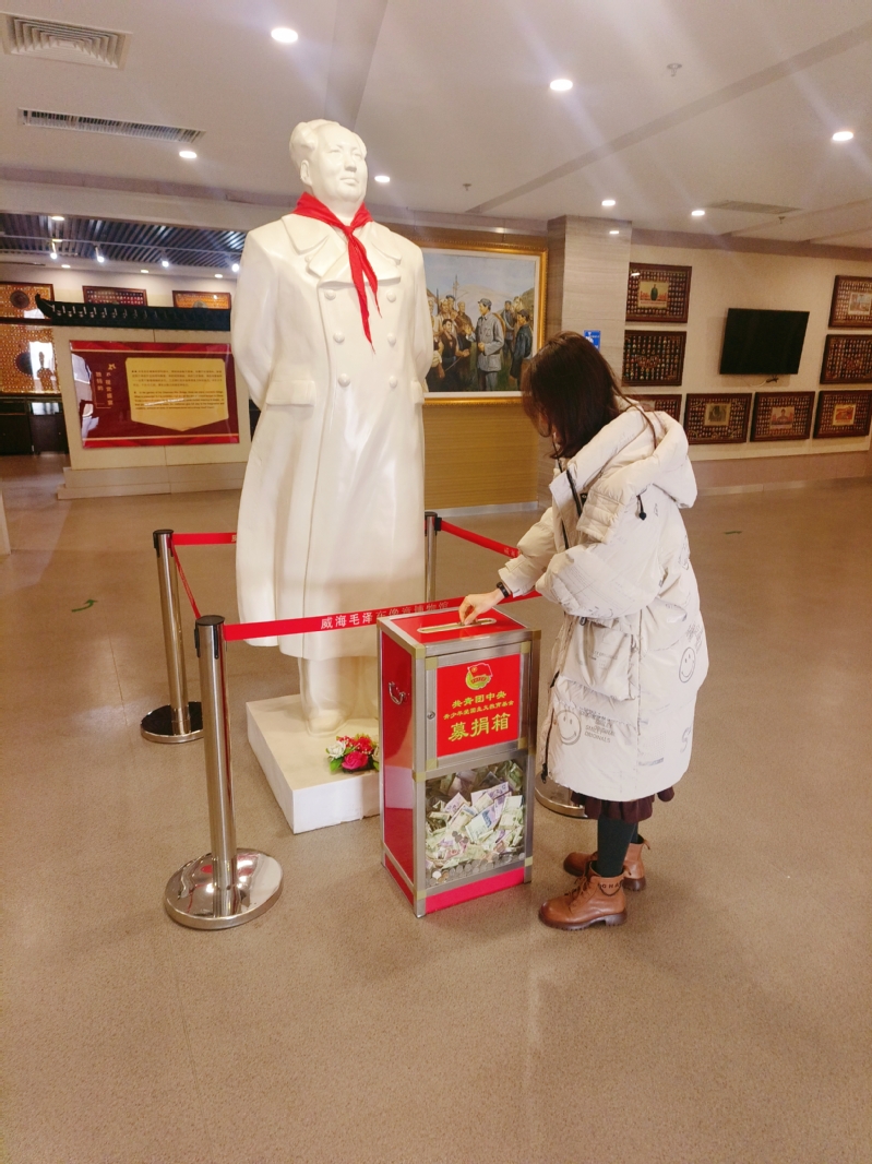 为深入学习党史,赓续红色精神,汲取奋斗力量,2月16日,赤华实践队成员丛琬蕙,前往参观威海毛泽东像章博物馆,学习红色精神,并于馆内募捐。