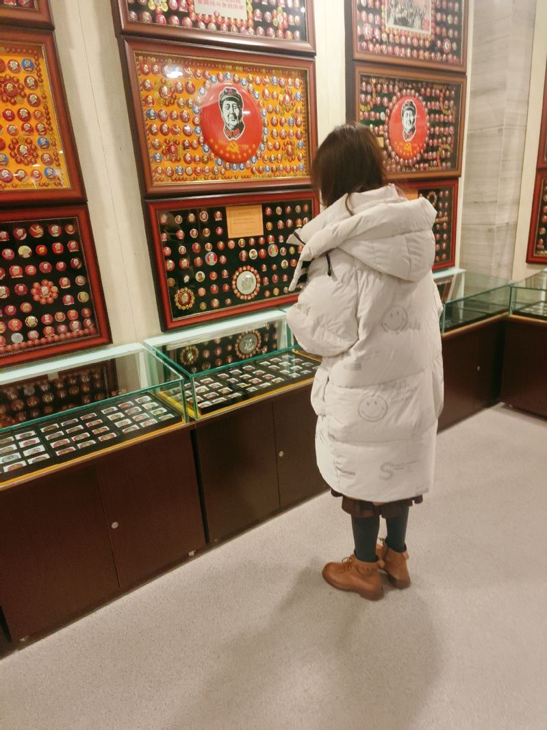 在纪念馆内,丛琬蕙参观学习、阅读馆内文献,九成以上毛泽东像章为纯铝材质,还有金、银、铜、铁、木、陶瓷、塑料等;形状除了常见的圆形外,还有长方形、椭圆形、盾形等;小的直径仅1厘米,最大的直径达1.08米,重达23公斤。据悉,这些像章都按照不同历史时期布展,展示毛泽东一生在不同历史时期的身影,从韶山到安源,从秋收起义到井冈山,从遵义会议到延安窑洞,从百万雄师过长江到建国后社会主义建设的辉煌经历。“在我看来,这些像章不仅仅是像章,而是一种历史文化的情怀,是一种精神的鼓舞”,当实践队员问到像章的意义时于国杰说道,“很多像章背面写有文字,或标注人名和地名,或记述像章流转的经过,或记录那个年代的激情。”最后,实践队员以募捐的方式,助力红色精神宣传,同时向于国杰先生致敬。实践队员丛琬蕙表示,“作为青年学生,应学史崇德、学史增信,学史明理、学史力行,通过深入学习各地党的发展历史,加深对党的认识,坚定自己的理想信念,赓续先辈坚持真理、担当使命、英勇斗争,不负人民的伟大精神,让青春投身于建设社会主义现代化的伟大实践中。”