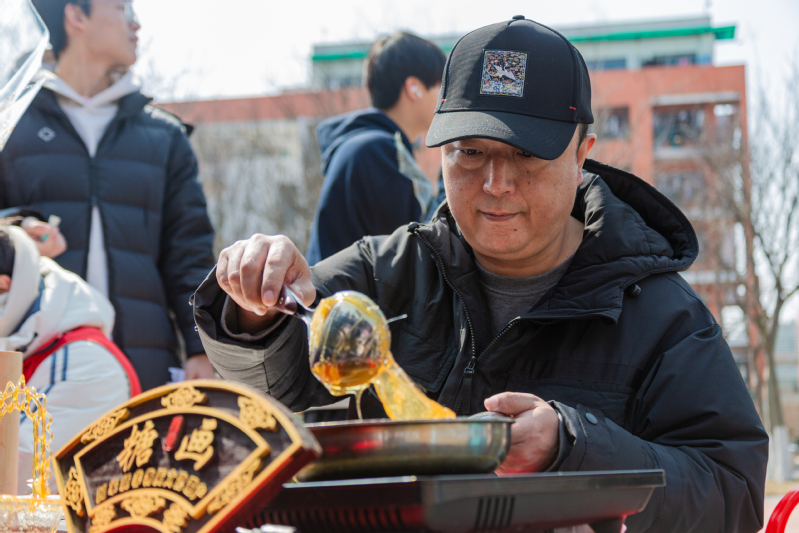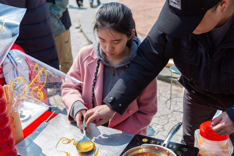 3月10日,学院学生会在荟萃广场举行“邂逅非遗,巧手匠心”思美节游园活动,活动邀请到非遗糖画的传承人林燕军老师,带领同学们走进美好的糖画时光,品味传统韵味,感受非遗之美。以勺为笔,以糖为墨,在老师精湛的手艺下,玫瑰、蝴蝶、爱心、小兔子……一幅幅活灵活现的作品烘托出节日的气氛。“以前只在电视上看到过糖画制作,这是第一次近距离感受和体验,我也充分感受到了非物质文化遗产的独特魅力。”学院2021级本研一体化班(材料类)学生杨裕在老师的指导下体验了糖画制作。