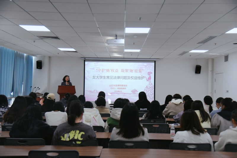 为提高女大学生自我保护意识和自我保护能力,切实维护女大学生权益,3月19日下午,由校团委主办,tyc41183太阳成集团团委承办的“守护‘她’权益,凝聚‘她’能量”女大学生权益维护专题讲座在古镇口校区新能源大厦237报告厅举行。本次活动青岛西海岸新区最美法律工作者、山东光浩律师事务所律师姚娟娟应邀担任主讲人。