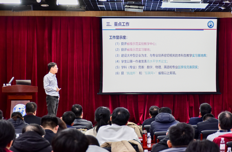 副院长王荣明对本科教育工作进行了部署。他首先结合2018年以来全国高教领域标志性会议和本科教育教学标志性文件提出的教育的根本问题(培养什么人、怎样培养人、为谁培养人)、教育的生命线(基础学科、新兴学科、交叉学科高质量发展)、教育的重要任务(产教融合、科教融汇)、教育发展的动力(育人方式、办学模式、管理体制、保障机制、教材建设、教育数字化等改革创新)、教育的影响力(“引进来”和“走出去”)、强教必先强师(坚持立德树人、强化师德师风建设)等精神进行了解读,并对学院本科教育的基础和存在问题进行了说明。接着,他围绕学院“人才培养质量五年提升工程”分别从制度建设、专业建设、课程及教材建设、实践教学和创新创业教育平台建设、质量保障体系建设、教育教学改革、招生工作、本研一体化培养等9个方面,按照思路、目标、举措、显示度进行部署和要求。最后,他结合新时代教育发展趋势,对教育数字化的工作内容(教育管理数字化、教学内容数字化、教学方法数字化)、工作举措(教师信息化素养提升、虚拟仿真实践互动教学平台)以及数智化背景下学院教学改革项目进行说明。