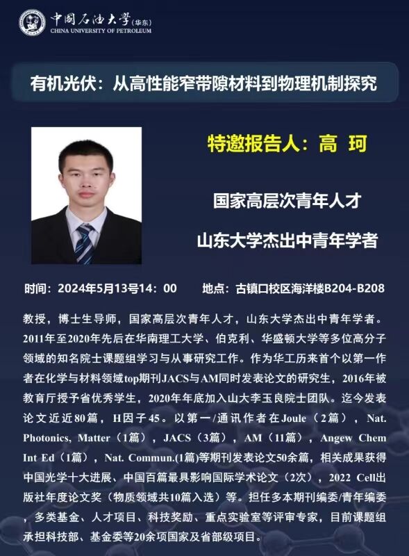 【学术报告预告】有机光伏:从高性能窄带隙材料到物理机制探究