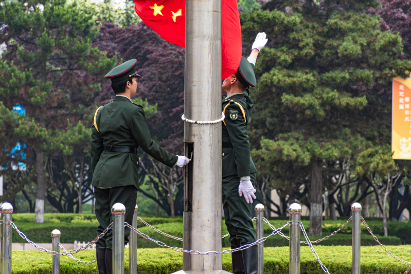 6时40分,升旗仪式正式开始,国旗护卫队迈着铿锵有力的步伐入场,国歌奏响,全体肃立,五星红旗冉冉升起,气氛庄严而神圣。