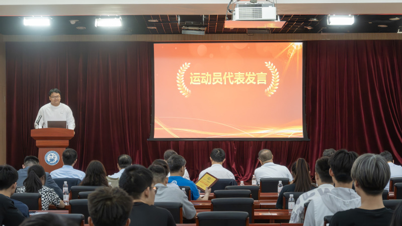 在昂扬的音乐声中,各位领导和嘉宾依次上台为在青年健身节和学校运会中取得优异成绩的运动员和运动队代表颁奖。校运会运动员代表、男子甲组铅球比赛冠军2023级本科生周梓畅,毕业生运动员代表、2021级研究生侯琦作为学生运动员代表发言。周梓畅回顾了自己进人大学从第一次接触投掷训练到铅球项目夺冠的经历,他表示体育是最公平的,只要肯努力、付出汗水,就会有收获,通过体育训练自身的意志力得到了磨炼,身体素质得到了提高,这些收获将终身受益。侯琦向在场运动员们讲述带伤比赛的历程中说道,每一次训练和比赛中的咬牙坚持,都是对意志力和毅力的考验,全力以赴,拼出最好的自己,就是胜利;他感谢学院和队友帮助与鼓励,表示今后将在工作中继续发扬顽强拼搏的体育精神。学院体育终身成就奖获得者许敬年老师上台发言,勉励在场运动员,他表示,体育是一种精神、一种生活态度,体育锻炼带来的精气神能够赋予人生无限的动力和活力,希望各位运动员能够在体育精神的激励下,在未来的人生路上披荆斩棘,取得更大突破。