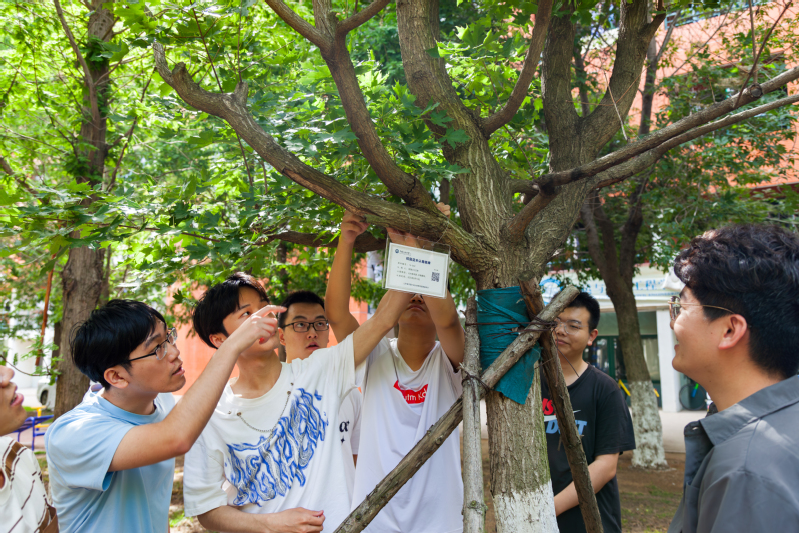 门小刚、孙茂骥分别与材化2001班班长乔远通、材器2002班班长冯绍桓一起将认捐铭牌挂在认捐的两棵树上,并颁发认捐证书。