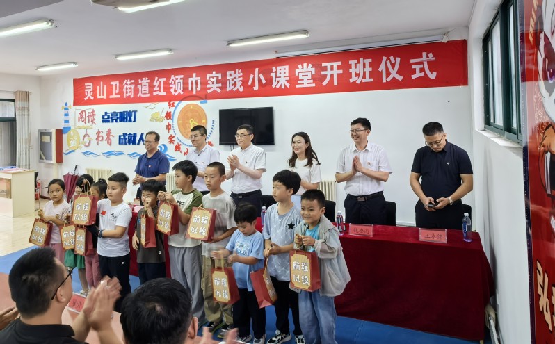 仪式伊始,周兆燕代表灵山卫街道以及镇海门社区对我校师生的到访表示热烈欢迎和衷心感谢,并对所开展的红领巾实践课堂给予高度肯定。马国刚代表学校向与会人员,对红领巾课堂课程体系进行了详细介绍,并对课堂品牌建设提出了殷切期望,期望红领巾课堂为和谐社区建设贡献力量。赵雅宁代表实践课堂授课教师志愿者进行发言,用心、用情了解每一位孩子的独特需求与梦想,加强培训,提升教学质量,为学生的暑期学习成长保驾护航。随后,各位领导向学生发放学习用品。