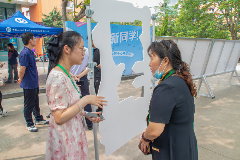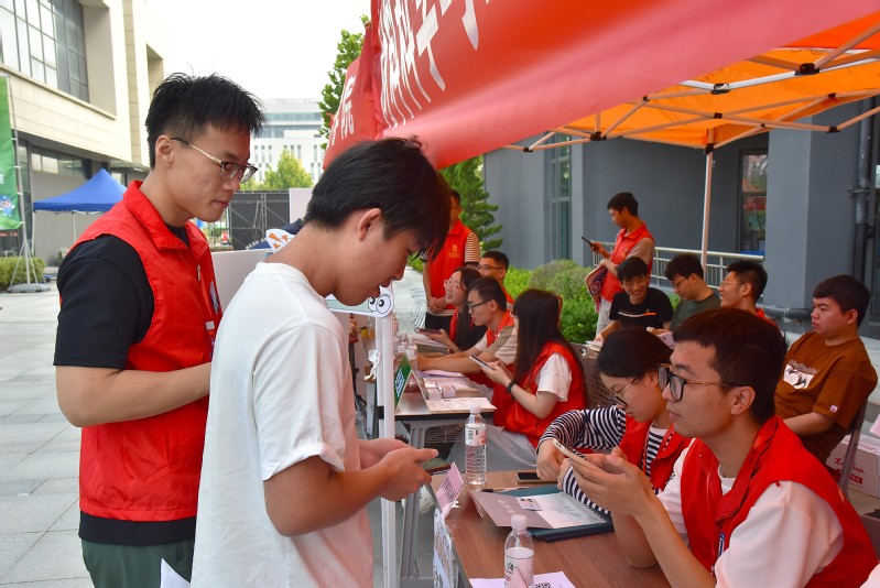 唐岛湾校区志愿者为新生办理报到手续 舒琳雁摄
