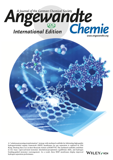 HOF是一类由有机配体通过氢键组装而成的新型晶态多孔材料,独特的溶解加工性使HOF可以简单、规模化成型。如何通过溶解加工法构筑连续且热力学稳定的HOF晶态分离膜,仍存在挑战。对此,团队利用“溶解加工-原位转化”策略,将HOF膜的连续成膜步骤与结晶生长步骤耦合:利用“脚手架”分子,将溶解加工法制备的连续但无定形的超分子涂层原位转化为晶态多孔HOF膜,实现了氢气的高效分离与纯化。该成果以“In situ Transformation of Amorphous Supramolecular Coating to Hydrogen-Bonded Organic Framework Membrane to Trigger Selective Gas Permeation”为题以内封面论文发表在Angewandte Chemie International Edition上,博士研究生张彩艳为第一作者,孙道峰教授和康子曦教授为通讯作者。