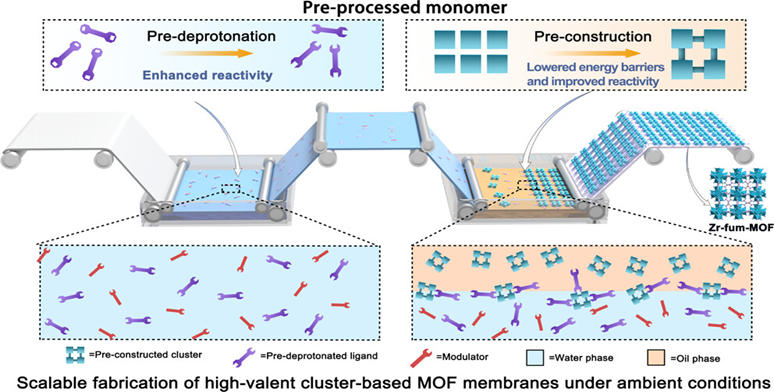 膜分离技术在化工分离过程中展现出广阔的应用前景,实现高效膜分离的关键之一在于新型高性能膜材料的开发,然而该过程中往往忽视在实际应用中重要的规模化膜制备问题。鉴于此,团队提出预加工-界面聚合(PMIP)策略,实现了在室温下,通过辊对辊工艺,在商业化聚合物基底上大规模、连续制备稳定的高价簇MOF膜。所得的大面积PMIP-Zr-fum-MOF膜材料展现出优异的氢气分离能力。该策略对多种MOF结构和基底具有普适性,目前正在进行工业化应用开发。该成果以“Preprocessed Monomer Interfacial Polymerization for Scalable Fabrication of High-Valent Cluster-Based Metal–Organic Framework Membranes”为题发表在Journal of the American Chemical Society上,博士研究生丰阳为第一作者,孙道峰教授和康子曦教授以及新加坡国立大学Zhao Dan副教授为通讯作者。