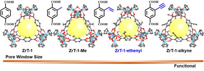 高纯度乙烯是生产高端化工产品的关键,然而在裂解烃类生产乙烯的产物中不可避免地混有乙炔和乙烷。此外,生产过程中使用水蒸气作为稀释剂以降低反应物料的分压,导致产生的废水中含有低碳烃类混合物。因此,在气态和液态下分离乙烯非常重要。团队利用网状化学策略将不饱和键(乙烯基和乙炔基)引入羧酸配体,设计合成了两种新型Zr-MOC (ZrT-1-ethenyl和ZrT-1-alkne)。借助MOC的可溶特性,ZrT-1-ethenyl同时实现了气、液条件下从C2H2/C2H4/C2H6混合气中纯化乙烯(>99.7%)。该成果以“Precise Pore Engineering of Zirconium Metal-Organic Cages for One-Step Ethylene Purification from Ternary Mixtures”为题发表在Angewandte Chemie International Edition上,博士研究生冯雪莹为第一作者,范卫东副教授和卢玉坤教授为通讯作者。