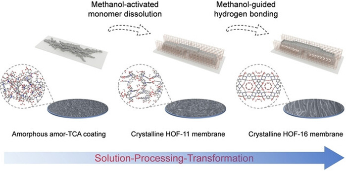 (2)溶解加工-原位转化无定形超分子涂层为氢键-有机框架(HOF)膜,实现选择性氢气渗透