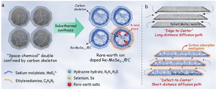 由于钾离子在Se-M-Se片层结构中插入和传输需要克服一定的能垒,目前MSe2材料通常表现出缓慢的反应动力学,实现高效的“插层-转化”反应仍然存在很大的挑战。实际上,被忽视的由表面吸附控制的电容型工作机制,是具有实现碱金属离子快速储存潜力的,但这需要MSe2材料尽可能多地暴露Se-M-Se基面。为了实现这一目标,本文开发了稀土离子诱导预激发策略,一系列稀土离子(Re=Lu3+,Tm3+,Y3+,Gd3+,Sm3+,Nd3+和La3+)被引入Se-Mo-Se基面上,以产生丰富的表面活性位点。稀土离子具有合适的离子半径和独特的核外电子结构,可以很容易地取代Se或Mo原子,在Se-Mo-Se基面上留下高达14.2%的Se空位。因此,钾离子可以优先吸附在表面空位上。随后,这些被吸附的钾离子穿过Se-Mo-Se基面从缺陷位点而不是边缘,完成随后的“插层-转化”反应。由于这种集成的工作机制,组装的钾离子电池和钾离子电容器提供了卓越的钾离子存储能力。该工作以题为“Rare-earth ions induced pre-excitation of intercalation-conversion anode to achieve fast potassium-ion storage”发表在 Energy Storage Materials上,论文第一作者为崔永朋副教授,通讯作者为崔永朋副教授、邢伟教授和唐永福教授,通讯单位为中国石油大学(北京)、太阳成集团tyc41183和燕山大学。