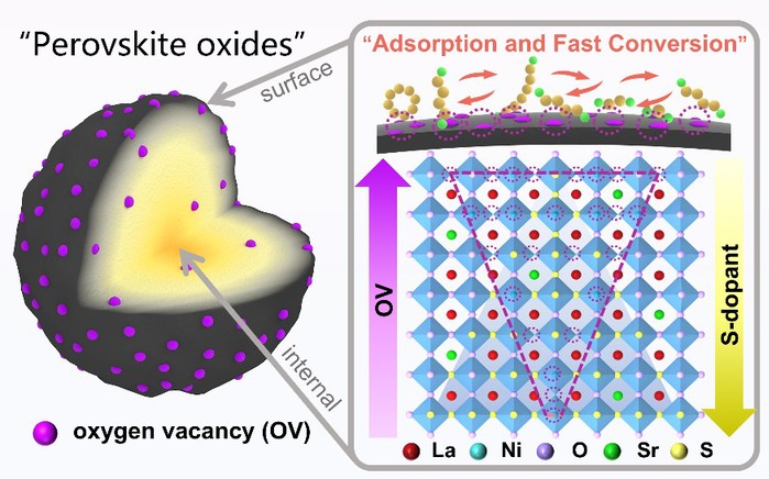 钙钛矿型氧化物材料结构灵活可调控,是一种十分有前景的电催化剂,可以通过化学吸附和催化转化途径有效抑制锂硫电池中多硫化锂(LiPSs)的穿梭效应。但是受限于表面氧空位浓度,钙钛矿型氧化物催化转化LiPSs的效果不佳。针对该问题,我院先进材料团队设计了一种具有梯度氧空位工程的钙钛矿型氧化物催化剂(Sr0.05La0.95NiO3-x-σSx, Sr-LNO-S),通过简单的硫辅助二次煅烧的方法,实现了氧空位从催化剂表面到内部的梯度分布,从根本上激活了材料的表面态,实现了锂硫电池在高倍率下的长循环性能突破。该工作以题为“Radically activating surface status of perovskite oxides by gradient oxygen vacancy engineering for high-rate and durable Li-S battery”发表在Energy Storage Materials(2025,75,104065)上。2022级硕士生齐日新与赵联明副教授为共同第一作者,我院先进材料团队的邢伟教授与刘鹏云副教授为共同通讯作者,太阳成集团tyc41183为第一通讯单位。