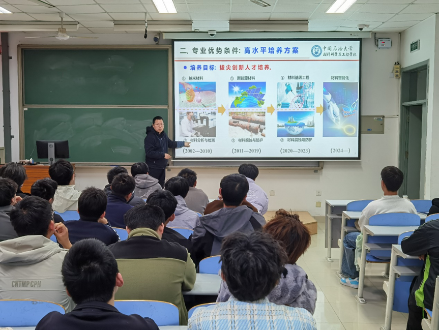 孙霜青老师详细解读2023级材料物理专业两大方向——材料基因工程与材料腐蚀与防护,从学科定位、发展沿革到培养方案进行全景式剖析,并结合优秀毕业生严克友的成长案例,对比分析不同方向的就业前景与深造路径;李振老师聚焦课程体系,解析两个方向核心课程的逻辑架构与教学内容,助力学生明晰学习规划;王志坤老师则从职业发展视角,强调选择方向需综合个人兴趣与行业需求。讲座特别设置师生互动环节,教师团队针对学生提出的学业困惑逐一解答,并听取各班班长关于班级学风(挂科率、课堂参与度及纪律表现)的反馈,为后续精准化教学管理提供依据。