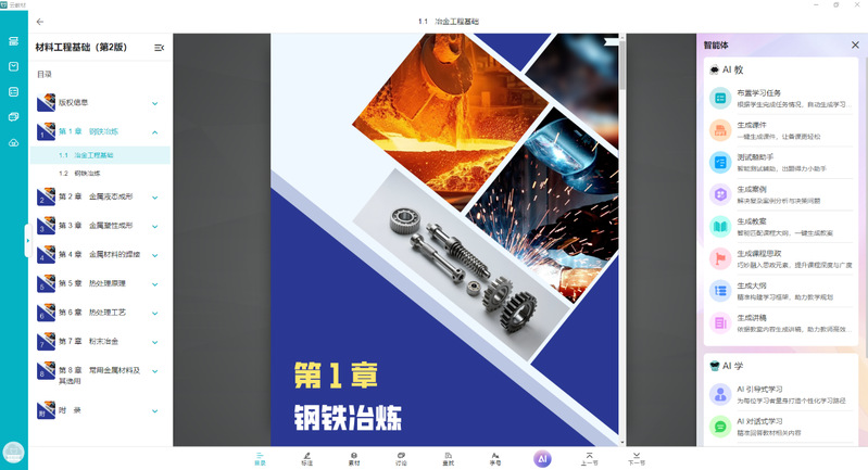 该教材以“新工科”立体化教学体系为框架,打破传统教材物理边界,深度融合数字技术与工程实践,集知识传授、虚拟仿真、智能交互于一体,打造沉浸式学习体验。构建“基础理论—工艺技术—行业应用”三维知识网络,依据“知识点锚点”设计,形成模块化知识体系,有机融入78个教学/工艺视频、358个VR 3D模型、53个AI听书音频、139处智能链接标注以及课程思政、传统文化等元素,实现价值引领。同时支持自然语言交互的三大AI学习模式:对话式、探究式、引导式学习,接入DeepSeek推理模型实现24小时AI学习辅助,配备AI智能评估系统,实时反馈学习成效。