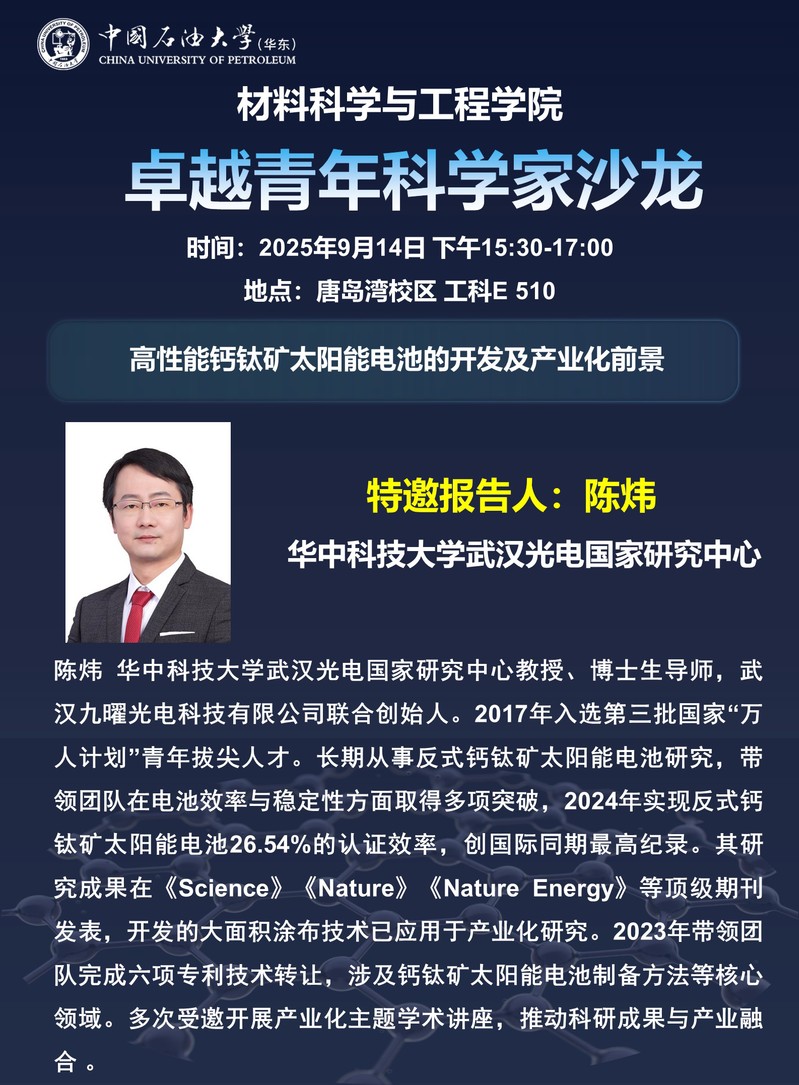 【学术报告预告】高性能钙钛矿太阳能电池的开发及产业化前景