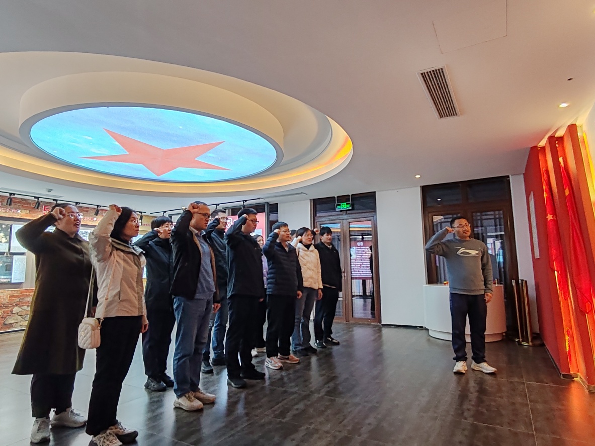 研学首站,教师们走进日照市抗日战争纪念馆。作为山东省内重要的爱国主义教育基地,馆内陈列着收藏家刘军华悉心搜集的大量抗战文物。从1931年至1945年的历史文献、军事地图到日军轰炸遗留的实物炮弹,从中国军民使用的石雷、大刀到大量珍贵的影像资料,每一件展品都是历史的无声证言。在纪念馆内,党员们在支部书记刘和元的带领下,面对鲜红的党旗,庄严地重温了入党誓词。铿锵有力的誓言不仅是对革命先烈的深切缅怀,更是对教育初心和使命担当的再次坚定承诺。参观过程中,大家还就“科技自强与国家命运”的主题进行了现场交流,深刻认识到自身工作在服务国家能源战略、推动绿色发展中的重要意义。