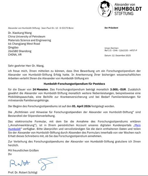 近日,tyc41183太阳成集团孙道峰教授团队的2025届博士毕业生王小康获得德国亚历山大·冯·洪堡基金会(Alexander von Humboldt Foundation)正式通知,成功入选洪堡博士后研究资助项目,并荣获“洪堡学者”称号。这是该团队继2022届王雨桐博士之后,培养的第二位获得此项国际殊荣的博士后研究人员。