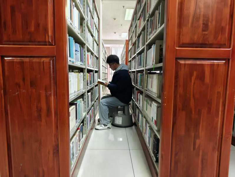 学生在图书馆专心致志地自习