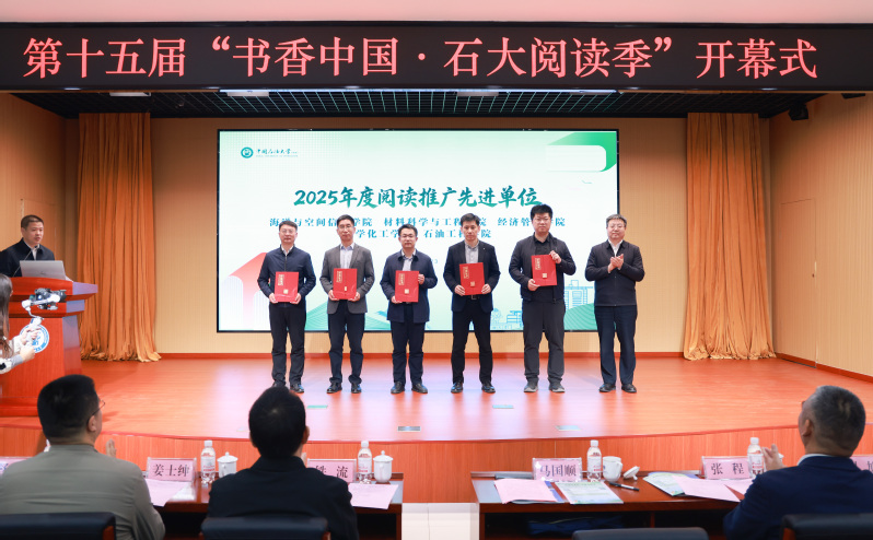 4月23日,在第31个世界读书日来临之际,学校在逸夫楼报告厅举行第15届“书香中国·石大阅读季”开幕式,启动阅读季系列活动,发布《太阳成集团tyc411832025年阅读报告》和 “书香石大”新版阅读推广平台,并对2025年度阅读推广先进单位、先进个人和优秀项目进行表彰。其中,我院获评“2025年年度阅读推广先进单位”。